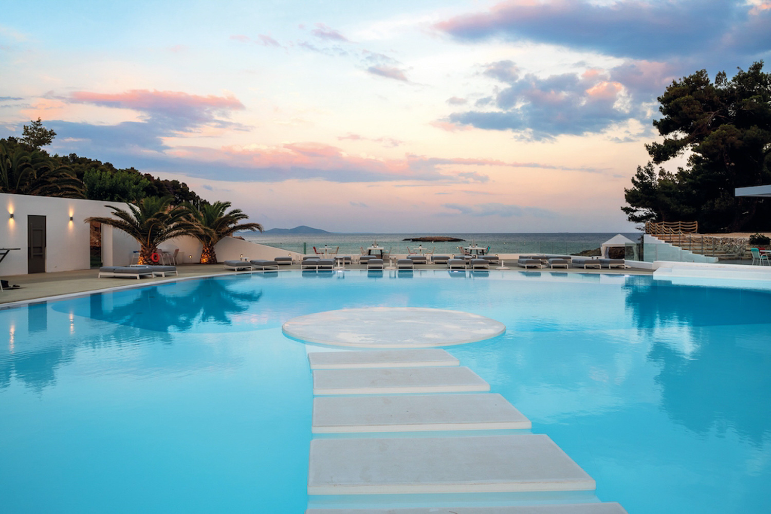 Komfortní resort zasazený do borového lesa s výhledem na moře, soukromými plážemi, bazénem a skvělou gastronomií. Jóga může probíhat pod pergolou i přímo na molu u moře.